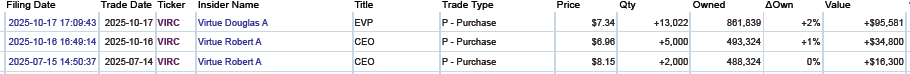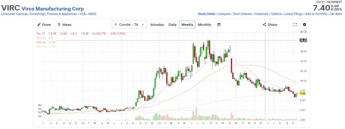 The stock price of VIRC has been crushed for the last year. It was a somewhat famous microcap short thesis in 2024, based on the idea that VIRC had been temporarily over earning, but the margins would return to historical norms. Things might be turning around for VIRC now, they manufacture entirely within the US, and with the new reciprocal tariffs, it might be their time in the sun. The Virtues seem to think so, although insiders have notoriously bad timing, even if they are good at detecting undervaluation. Maybe the stock was a short at $18, but maybe it’s a buy at $7.40 with consensus 2026 earnings per share of $1.15.