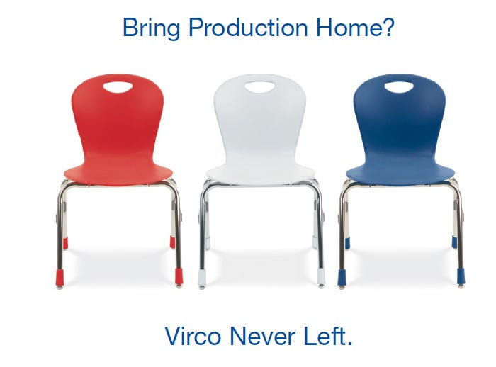 While I don’t have the data from this current back to school season yet, going into this season the order backlog was down by 30% over last year. Still, the Virtue management team has been focusing on cost cutting, and even on lower volumes, Virco had its most profitable quarter in years. Virco probably has between 20% and 30% of the domestic educational furniture market, and there is a chance to take market share due to the reshoring emphasis. Many of their competitors also manufacture in the US, but three out of seven are importers.