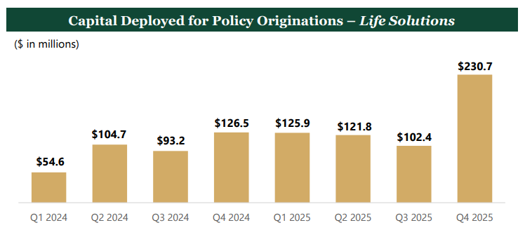 And even more importantly, CEO Jay Jackson regarding capital deployment said, “we expect this momentum to continue accelerating in 2026. Chief Capital Officer Elena Pasco, who is part of the team who will be buying life settlements from private credit funds, said, “As we enter 2026, our capital deployment pipeline is robust.”