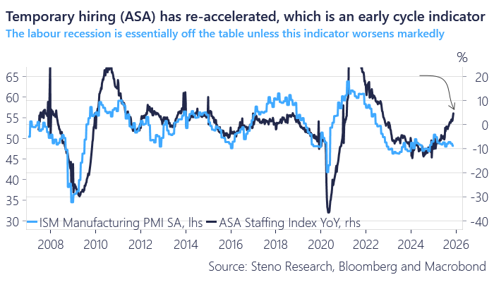 Before Trump’s Liberation Day, small business optimism and plans to hire were reaching new highs. But then uncertainty paralyzed growth plans. Their longer term capex plans still remain, however, even if they were on hold for 2025. The combination of interest rate cuts, tariff certainty, and 100% accelerated depreciation on qualifying equipment is quite an incentive to bring growth initiatives back to the front burner. There is already a pickup in temporary hiring, which typically precedes permanent hiring. Businesses need more manpower, but they want to see if business conditions really are stable.