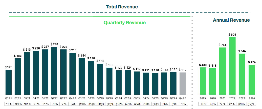 ZipRecruiter just had their first year over year volume increase since tech began their year of efficiency three years ago. You might have to squint to see it, but Q4 2025 revenue was $112 million compared to Q4 2024 revenue of $111 million. This is the first positive revenue comp in twelve quarters. This might be early, and maybe you can afford to keep ZIP on your watchlist for a while, but the market is forward looking.