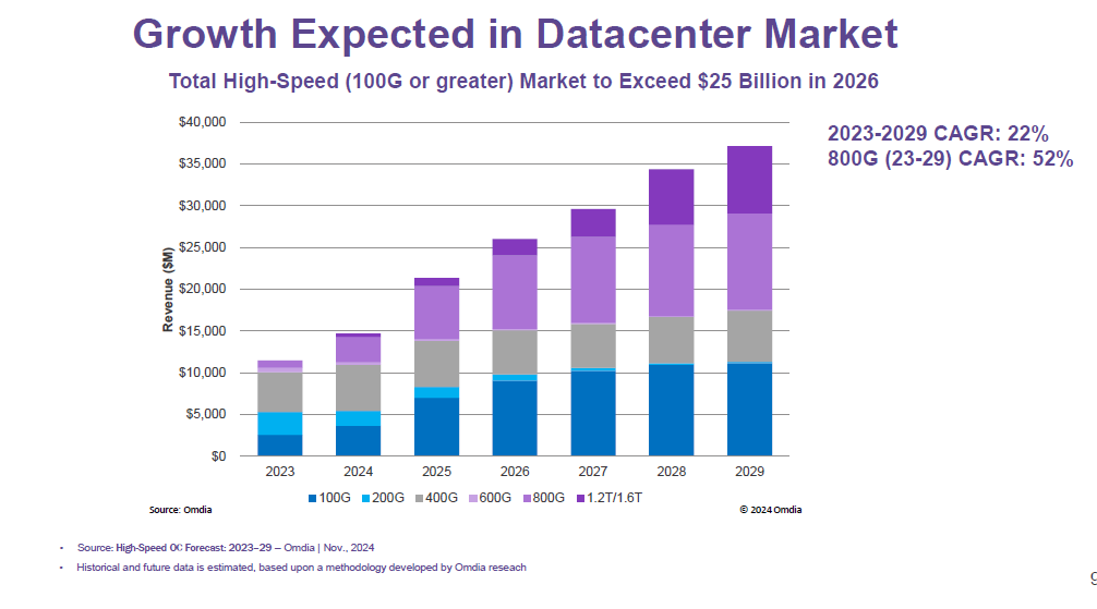 The current price to sales ratios of their peers is between 4.5x and 6.5x up from a more historical 3.5x. This increase in valuations across the board anticipates the enormous growth rate of the data center buildout, with the demand for 800G transceivers projected to be growing at 52% a year through 2029. Forecasts are for the $15 billion transceiver market to reach $25 billion in 2026, and $35 billion in 2029.