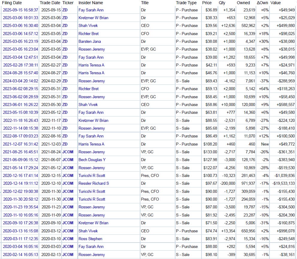 Putting a price target on a rough gemstone that is about to be split in two is a bit of a fool’s errand. It isn’t clear which units will be sold, and at which multiples. Perhaps in a few years, when the disruption from AI has settled down, companies like ZD could return to a 3.5x price to sales ratio. But in the meantime, I find it hard to think that the price to sales ratio will get higher than 2.0x. At these prices, however, the aggressive share buybacks are doing a lot of heavy lifting, GAAP earnings per share are up 7% in the trailing twelve months due mostly to share buybacks and management continues to buyback shares hand over fist.